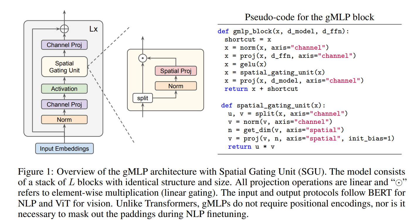 Transformers가 크게 성공한데 기여한 요인이 Multi-head Self-Attention인지, Feedforward Layer인지는 여전히 불명확하였다. 저자들은 Feedforward Layer이 미치는 영향이 클 수 있다는 점에 착안하여서, Channel Projection 외에도 Attention과 비슷한 효과를 줄 수 있는 Spatial Projection을 사용한 Spatial Gating Unit를 제안하였다.