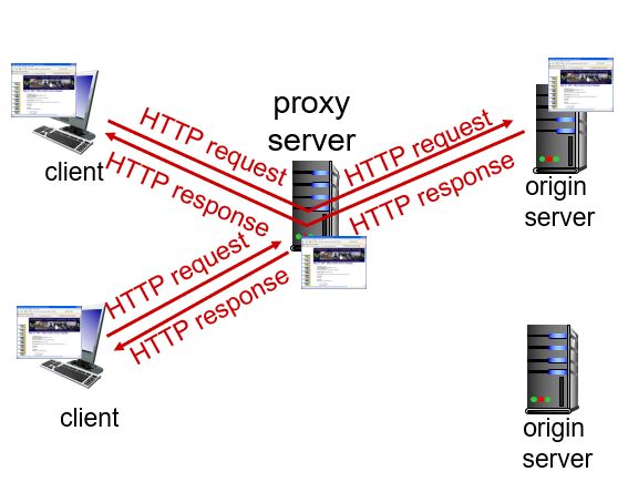 - Setting a proxy server, the client requests to the Web cache, and if it has a copy, it sends back, and if not, it requests to the server, stores a copy, and send back to the client.