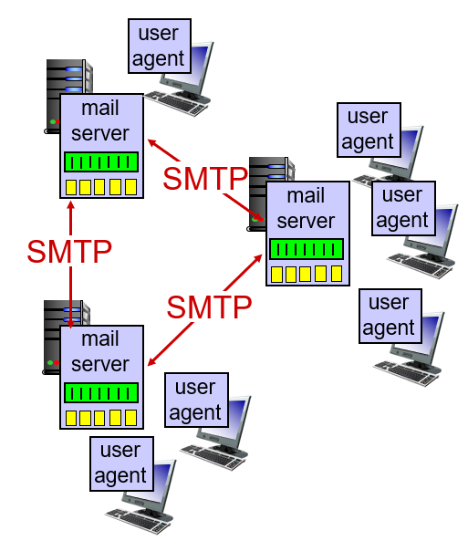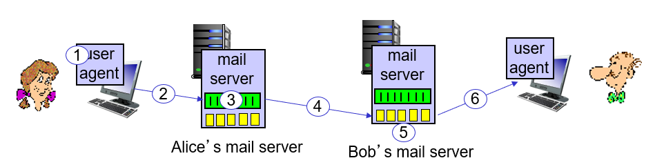 - Mail Servers consists of mailbox containing incoming messages for user.