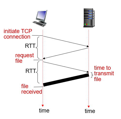 - Non-persistent HTTP response time takes 2RTT + file trnasmission time(One RTT to establish the TCP connection and one RTT to request and recieve an object).