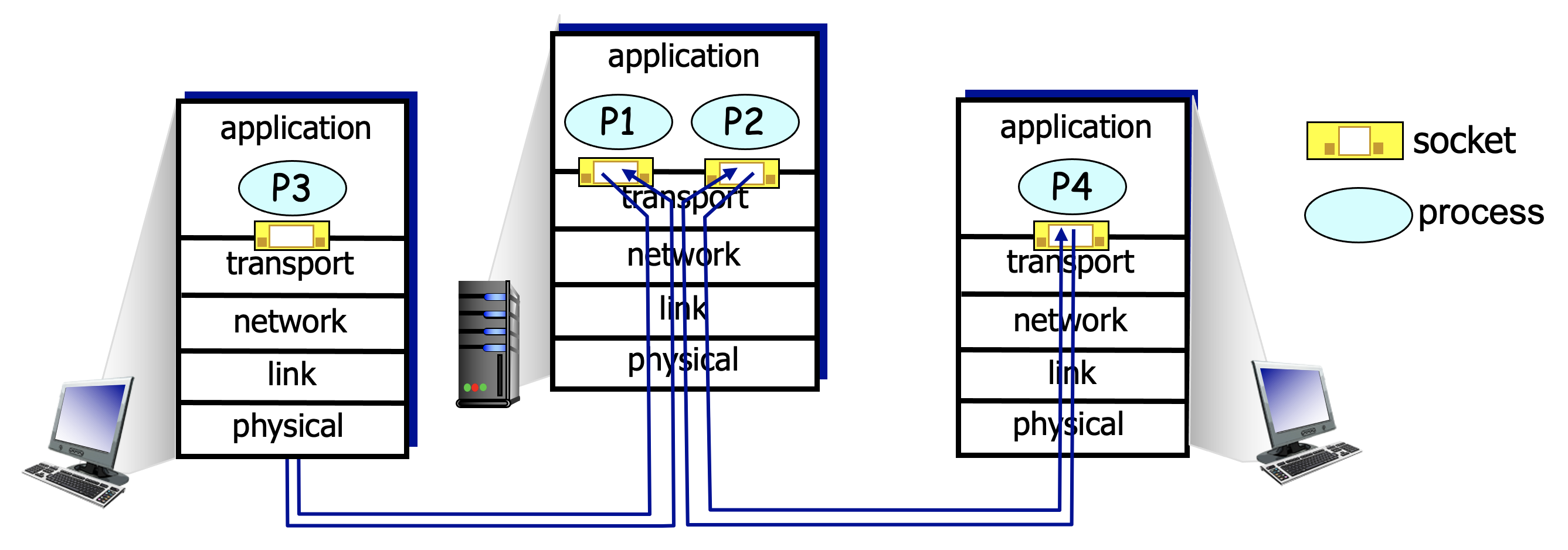 - Transport layer in the receiving host does not deliver data directly to a process, but instead to an intermediary socket, becuase at any given time there can be more than one socket in the receiving host, so each socket has a unique identifier.