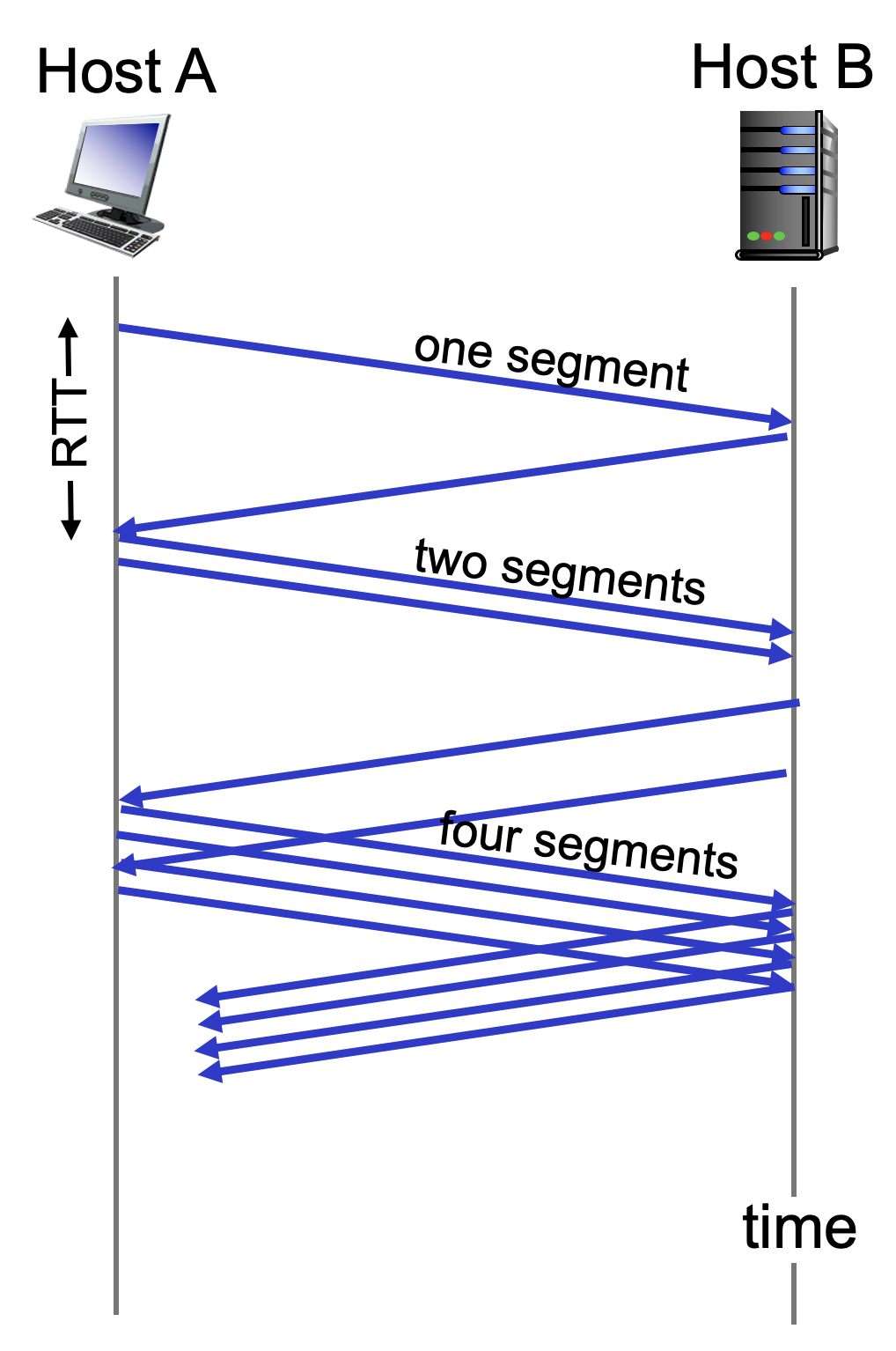 - When loss event is occured by timeout, set cwnd to 1 and grow exponentially. This is fast recovery.