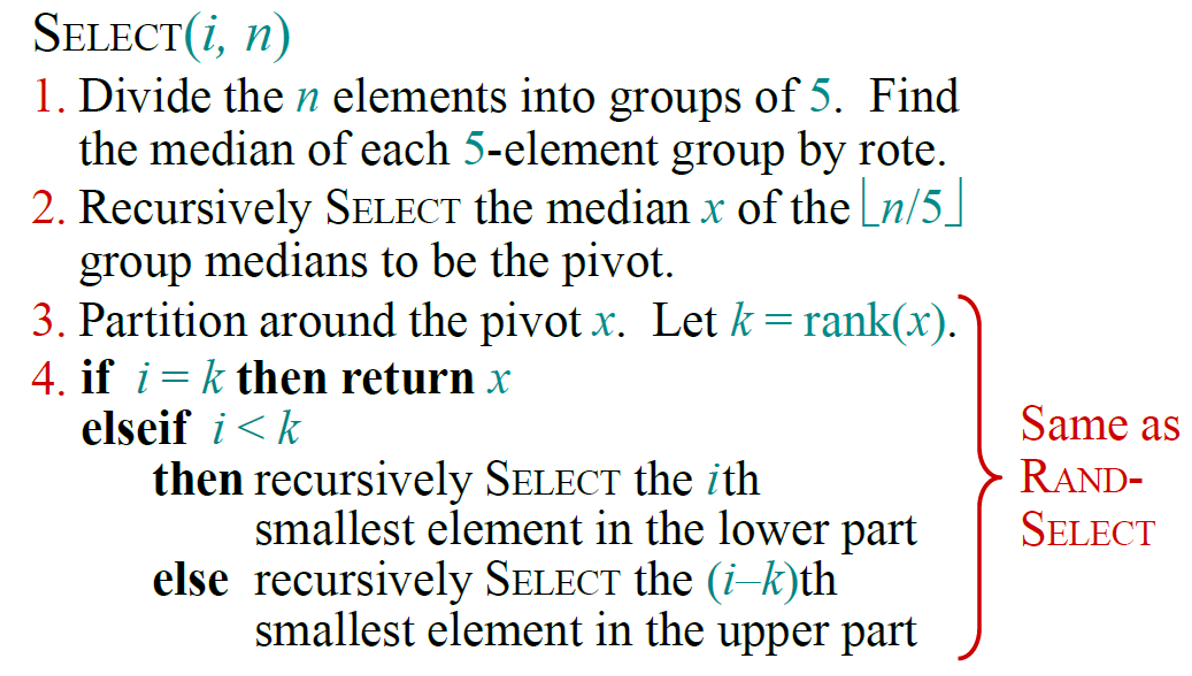 - The key idea to improve the algorithm to have O(N) runtime even in the worst case is to choose a good pivot recursively.