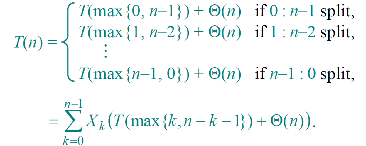 - Using indicator variable, Xk = 1 if PARTITION generates a k:n-k-1 split and 0 otherwise, we could analyze the average run time.