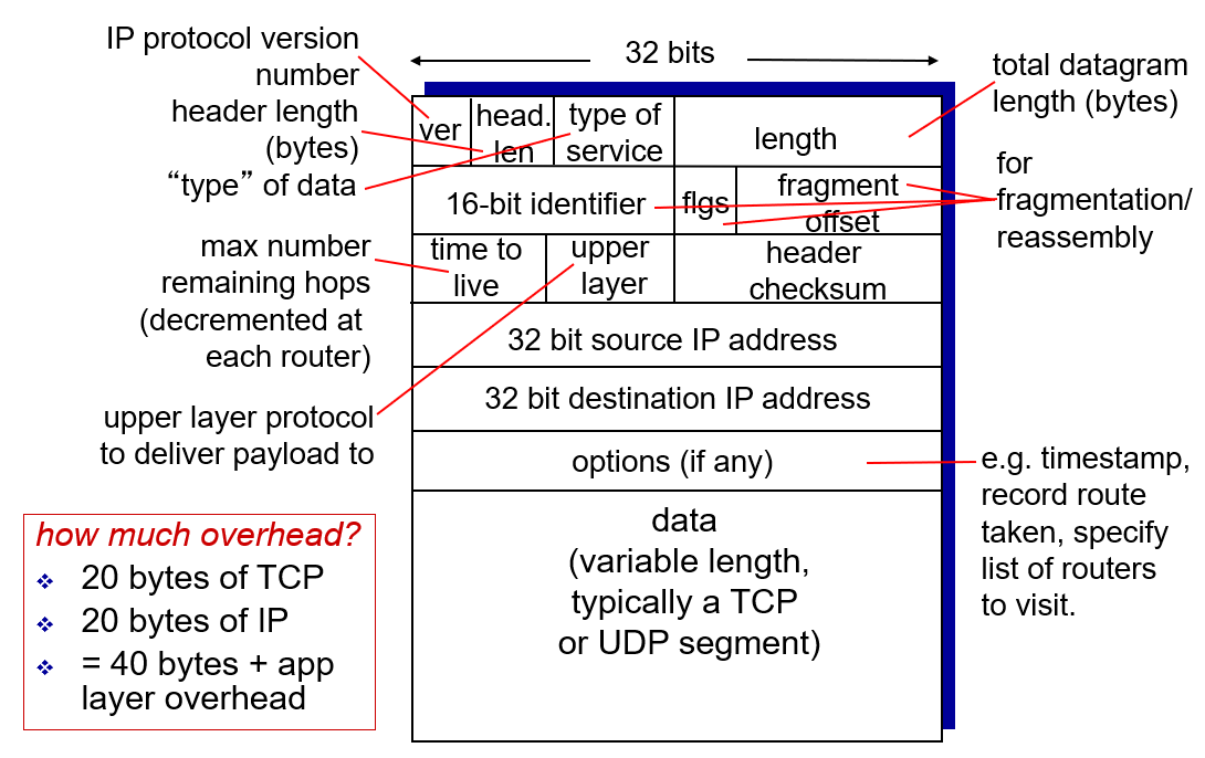 - Overhead is at least 40 bytes; 20 bytes of TCP and 20 bytes of IP.