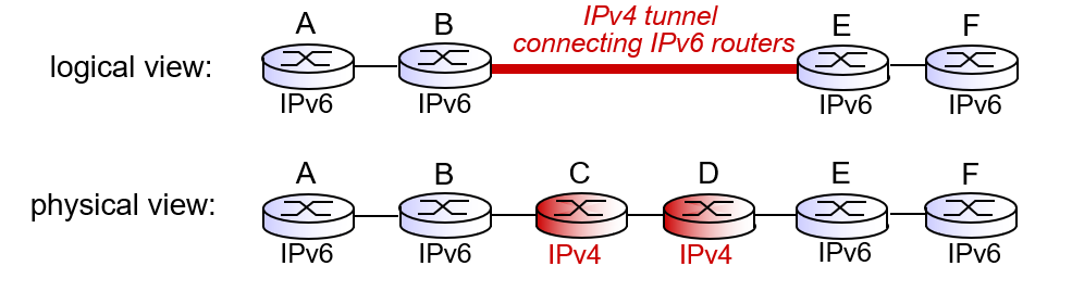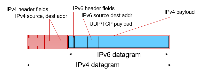 - Tunneling is IPv6 datagram carried as payload in IPv4 datagram among IPv4 routers.