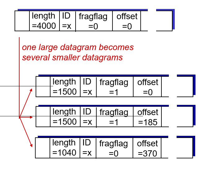 - Starting for IPv6, large datagram is dropped instead of fragmentation because it will cause burden to router.